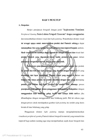 Mengeksplorasi dan menganalisis penerapan elemen visual terutama light painting pada fotografi komersial untuk produk peripheral gaming merek Fantech. Dalam industri gaming yang kompetitif, visual yang menarik dan berkualitas tinggi sangat penting untuk menarik perhatian konsumen dan membedakan produk di pasar. Melalui serangkaian proses produksi dan pengalaman visual seperti pencahayaan, komposisi dan warna yang berkontribusi pada persepsi dan minat beli konsumen terhadap produk Fantech, mampu menonjolkan fitur dan keunggulan produk Fantech. Penerapan konsep visual yang konsisten dengan branding Fantech memiliki peran penting untuk membangun identitas visual yang kuat dan memikat bagi target audiens. Hasil tugas akhir ini diharapkan dapat memberikan kontribusi praktis bagi fotografer komersial dalam meningkatkan daya tarik visual produk melalui fotografi yang inovatif.