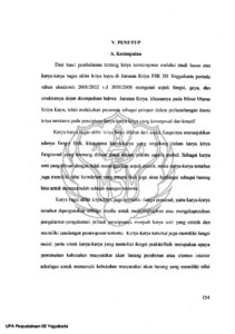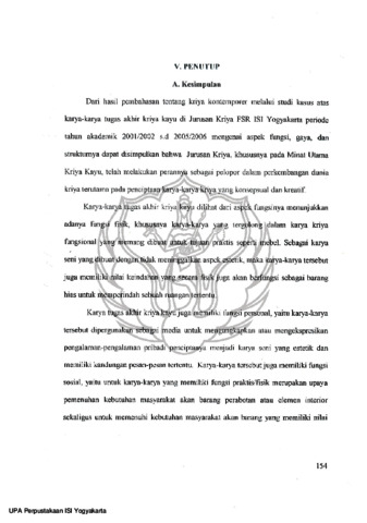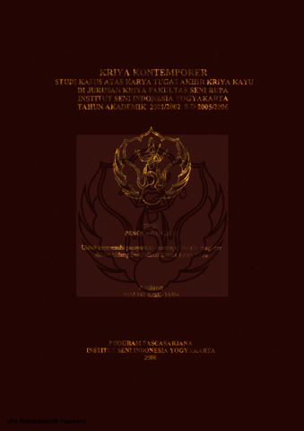 Kriya adalah cabang seni rupa yang memiliki cakupan luas karena meliputi artefak-arlefak yang fungsional maupun nonfungsional. Kriya telah menjadi salahsatu jurusan di Fakultas Seni Rupa lSI Yogyakarta yang menjadi pelopor dalam perkembangan dunia kriya. Sejak Jurusan Kriya lahir, bersama berdirinya ASRl hi ngga sekarang. Peran Jurusan Kriya salah satunya dapat di lihat melalui karya- karya yang di hasilkan oleh para mahasiswanya, khususnya karya-karya tugas akhir yang menjadi koleksi Jurusan Kriya, baik yang berupa karya seni maupun laporan tugas akhir yang j umlahnya ratusan buah. Sesuai dengan tujuan pengko leksiannya, karya tugas akhir tersebut merupakan dokumen penting sebagai objek penelitian. Kajian alas karya tugas akhir kri a kayu dalam penelitian ini dilakukan terh adap aspek fungsi, gaya, dan strukturnya. Aspek fungs i meliputi funs i personal ,sosial , dan fi sik; as pek gaya meliputi bagaimana masing- masing penciptanya mengungkapkan ekspresi individualnya.