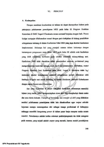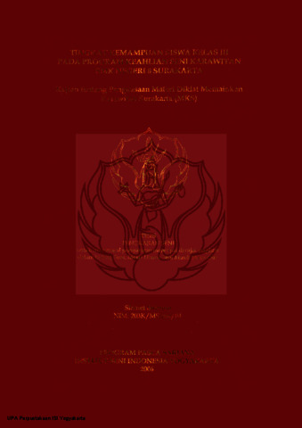 Penelitian ini bermaksud mengkaji kemampuan penguasaan mata diklatMemainkan Karawitan Surakarta (MKS) oleh siswa kelas III Pro[,'Tam KeahliallSeni Karawitan Sekolah Menengah Kejuruan (SMK) Negeri 8 Surakarta.Pennasalahan yang diajukan adalah (1) Bagaimana pelaksanaan Diklat MKS padaProgram Keahlian Seni Karawitan SMK Negeri 8 Surakarta dan (2) Bagaimana tingkat kemampuan penguasaan Materi Diklat MKS pad a siswa Kelas III ProgramKeahlian Seni Karawitan SMK Negeri 8 Surakarta.Tujuan penelitian antara lain: (I) Mengetahui pelaksanaan Diklat MKSProb'Tam Keahlian Seni Karawitan SMK Negeri 8 Surakarta, (2) Menelaah realita dilapangan mengenai tillgkat kemampuan penguasaan Materi Diklat MKS pada siswa Kelas III Pro[,'Tam Keahlian Seni Karawitan SMK Negeri 8 Surakarta, (3)Menemukan faktor-faktor yang mempengaruhi kemampuan penguasaan MateriDiklat MKS pad a siswa Kelas III Program Keahlian Seni Karawitan SMK Negeri 8Surakarta. Manfaat penelitian ini secara teoritis sebagai sumbangan pemikiranterhadap pengembangan ilmu pengetahuan di bidang kesenian mengenai kajianten tang proses belajar seni karawilan Jawa dan secara praktis dapat dijadikansebagai acuan bab>i para praktisi, siswa dan lembaga pendidikan kesenian dalam upaya pembelajaran kesenian, khusllsnya di bidang seni karawilan Jawa gayaSlIrakarta agar mencapai tingkat keberhasilan optimal sebagaimana yangdiharapkan. Teori yang digllnakan adalah hasil pemikiran Benjamin Brinner tentang compelence (kompetensi). Pengumpulan data menggunakan teknik wawancara,observasi dan studi dokl Unenter.Hasil penelitian menunjukkan proses belajar mengajar di SMK Negeri 8Sllrakarta dilaksanakan berdasarkan Kllrikulum 2004. Hasil yang dicapai lebihcenderung mengarah pada mencetak tenaga kerja siap pakai di dunia usahalduniaindustri yang mengakibatkan terciptanya tukanglpekerja. Kemampuan pengllasaanmateri diklat lebih pada ketrampilan teknis memainkan karawitan. Semlla itudipengaruhi faktor internal yang datang dari dalam diri siswa dan faktor eksternalmencakup kebijakan bidang pendidikan, Iingkungan keluarga, lingkllngan sekolahdan lingkllngan sosial.