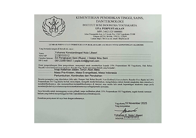 K. Nula Liliweri, Yohanes (2025) Imaji Keilahian dalam Tenun Atoin Meto Masa Pra-Kristen, Masa Evangelisasi, Masa Indonesia Pertumbuhan, Kontinuitas dan Perubahan. Doctoral thesis, Institut Seni Indonesia Yogyakarta.