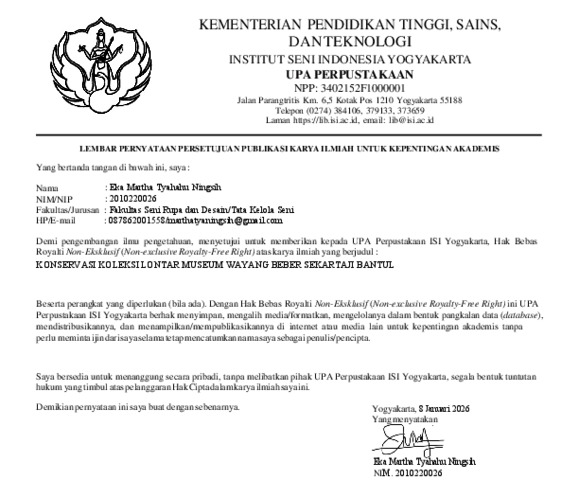 Martha Tyahahu Ningsih, Eka (2025) Konservasi Koleksi Lontar Museum Wayang Beber Sekartaji Bantul. Skripsi thesis, Institut Seni Indonesia Yogyakarta.