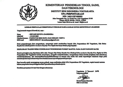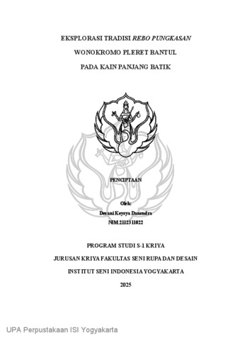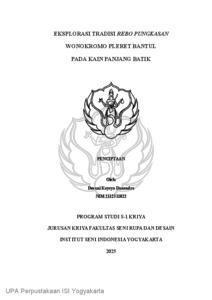 Tugas akhir berjudul “Eksplorasi Tradisi Rebo Pungkasan Wonokromo Pleret Bantul pada Kain Panjang Batik” ini bertujuan untuk menggali nilai-nilai budaya, simbolik, serta estetika dari Tradisi Rebo Pungkasan sebagai sumber inspirasi penciptaan karya batik tulis. Tradisi Rebo Pungkasan, yang dilaksanakan setiap hari Rabu terakhir pada bulan Sapar, memiliki rangkaian ritual, makna historis, serta kekayaan visual yang potensial diterjemahkan ke dalam motif batik. Proses penciptaan karya ini diwujudkan dengan teknik batik tulis gaya tradisional Yogyakarta, dengan menggunakan metode penciptaan oleh S.P. Gustami. Karya ini menggunakan metode pendekatan estetika oleh Dharsono, yang digunakan untuk menganalisis karya dari aspek keindahan. Karya yang dihasilkan menampilkan motif-motif yang terinspirasi dari elemen tradisi seperti arak-arakan, ubarampe, ragam sesaji, serta simbol-simbol doa dan harapan masyarakat Wonokromo.