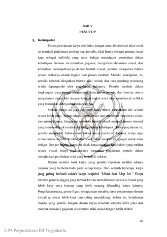 ABSTRAK Seorang pelukis melalui karyanya dapat merepresentasikan persoalan kehidupan sosialnya, Berangkat dari pengalaman personal dan pengamatan terhadap disorientasi nilai sosial dalam masyarakat modern yang memunculkan berbagai perubahan cara pandang terhadap baik dan buruk, yang sering kali membuat batas moral menjadi kabur, kecenderungan sebagian individu menjalankan norma hanya sebagai formalitas tanpa kesadaran mendalam. Penciptaan dilakukan melalui pengolahan gagasan yang diambil dari refleksi diri serta dinamika sosial yang diamati. Subjek matter tugas akhir ini direpresentasikan secara idiomatik dalam visual karya menggunakan pendekatan realisme dan figuratif. Penciptaan ini menjadi strategi untuk membangun suasana psikologis yang mencerminkan kegelisahan, disorientasi, dan kontradiksi moral. sebagai bentuk refleksi dan respons terhadap realitas sosial yang berubah, sekaligus sebagai upaya memperlihatkan bagaimana disorientasi nilai dapat diungkap melalui bahasa visual. Kata kunci: disorientasi, sosial, seni lukis, realisme, metafor.