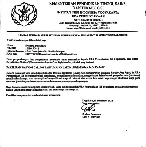 Dewantara, Pradana (2026) Pakeliran Wayang Calung Banyumasan Lakon Jumenengan Jaka Kaiman. Skripsi thesis, Institut Seni Indonesia Yogyakarta.