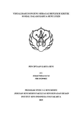 Tugas Akhir ini mengkaji proses penciptaan karya seni lukis dua dimensi yang berangkat dari rekonstruksi dongeng sebagai medium refleksi kritik sosial. Latar belakang penciptaan didasarkan pada pengalaman personal penulis dalam mengamati fenomena sosial di lingkungan urban, akademis, pertemanan, dan komunitas, yang memunculkan dinamika relasi sosial, keterasingan individu, serta tekanan sosial modern. Dongeng dipilih sebagai sumber narasi karena memiliki struktur simbolik dan nilai moral yang bersifat universal serta relevan untuk dimaknai ulang sesuai konteks zaman. Perwujudan karya dilakukan melalui seni lukis di atas media kertas dengan penggunaan cat gouache dan watercolor, menerapkan gaya visual ilustratif semi-kartunis, dekoratif, dan surealis. Teknik yang digunakan meliputi blocking, wet on wet, glazing, dan arsir untuk membangun suasana naratif dan simbolik. Penyajian karya dirancang melalui dua sistem display, yaitu karya kertas dipigura pada dinding dan karya kertas yang ditampilkan menggunakan hanger, guna menciptakan pengalaman visual dan konseptual yang berbeda bagi penonton. Penulis menghasilkan sebanyak 15 karya seni lukis dari judul Visualisasi Dongeng Sebagai Refleksi Kritik Sosial Dalam Karya Seni Lukis guna merefleksikan serta mengkritisi realitas sosial kontemporer.