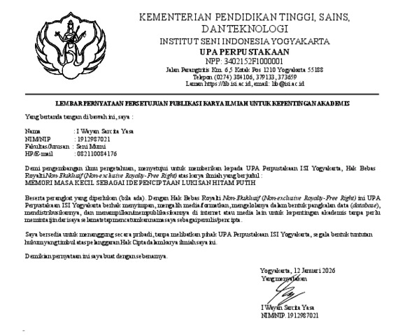 Sarcita Yasa, I Wayan (2025) Memori Masa Kecil Sebagai Ide Penciptaan Lukisan Hitam Putih. Skripsi thesis, Institut Seni Indonesia Yogyakarta.