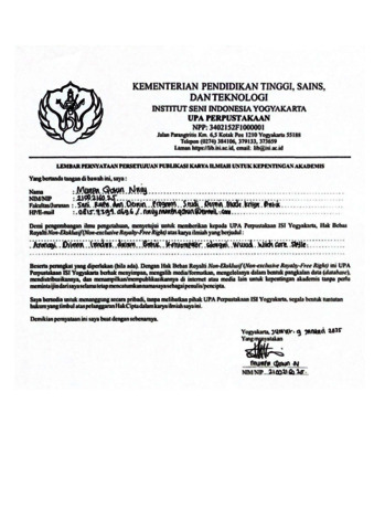 | Divisions: | Fakultas Seni Rupa > Jurusan Kriya > D3/D4 Batik dan Fashion | |||||||||