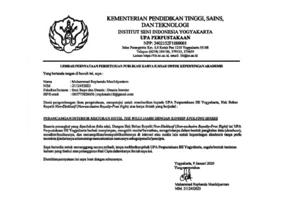 Rayhando Maulidyantoro, Muhammad (2025) Perancangan Interior Restoran Hotel The Wills Jambi Dengan Konsep Evolving Sense. Skripsi thesis, Institut Seni Indonesia Yogyakarta.
