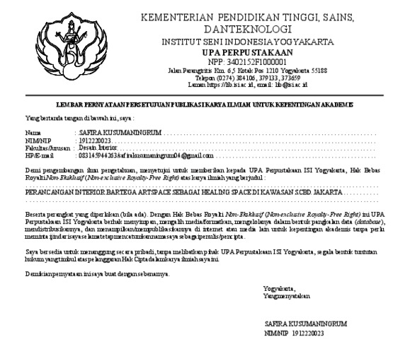 Kusumaningrum, Safira (2025) Perancangan Interior Bartega Artspace Sebagai Healing Space Di Kawasan Scbd Jakarta. Skripsi thesis, Institut Seni Indonesia Yogyakarta.