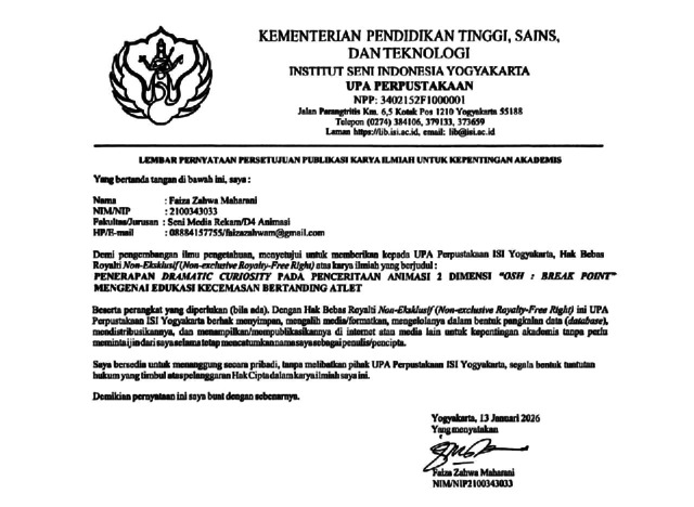 Zahwa Maharani, Faiza (2026) Penerapan Dramatic Curiosity Pada Penceritaan Animasi 2 Dimensi “OSH : Break Point” Mengenai Edukasi Kecemasan Bertanding Atlet. Diploma thesis, Institut Seni Indonesia Yogyakarta.