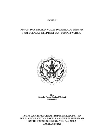 Puspa Candra Febriani, Camelia (2025) Fungsi Dan Larasan Vokal Dalam Lagu Iringan Tari Dolalak Grup Budi Santoso Purworejo. Skripsi thesis, Institut Seni Indonesia Yogyakarta.