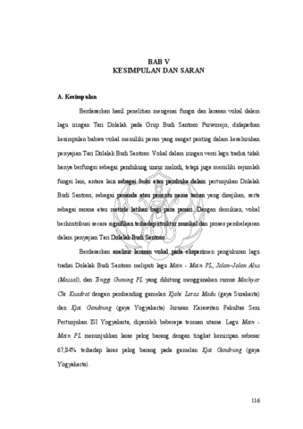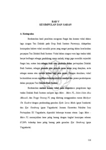 Penelitian dengan judul Fungsi dan Larasan Vokal Dalam Lagu Iringan Tari Dolalak Grup Budi Santoso Purworejo bertujuan untuk mengkaji fungsi vokal, struktur sajian, korelasi antara vokal, gerak tari, dan ricikan pengiring, serta konsep laras pada vokal lagu tradisi Dolalak Budi Santoso. Permasalahan laras menjadi relevan mengingat adanya pengarsipan notasi oleh R. Tjipto Wismojo pada tahun 1994/1995 yang memberi label laras pelog dan slendro, sementara dalam praktiknya penyajian Dolalak Budi Santoso versi tradisi tidak menggunakan ricikan melodis. Pada penelitian ini menggunakan metode kualitatif dengan pendekatan studi kasus. Penelitian ini dilakukan melalui analisis musikal, pengukuran frekuensi, serta penerapan formula Machyar Chi Kuadrat untuk mengetahui tingkat kemiripan larasan terhadap gamelan Kjahi Laras Madu (gaya Surakarta) dan Kjai Gandrung (gaya Yogyakarta) milik Jurusan Karawitan ISI Yogyakarta. Hasil penelitian menunjukkan bahwa vokal dalam iringan Dolalak grup Budi Santoso versi tradisi memiliki fungsi selain sebagai unsur melodi utama, vokal berfungsi sebagai buka atau pambuka pertunjukan, sebagai penanda jenis tarian yang akan disajikan, serta sebagai sarana latihan bagi penari untuk menjaga ketepatan ritme dan dinamika gerak. Dari aspek larasan, dengan menggunakan formula Machyar Chi Kuadrat lagu Main–Main PL menunjukkan kemiripan sebesar 67,84% dengan laras pelog barang pada gamelan Kjai Gandrung. Lagu Jalan–Jalan Alus (Massal) memiliki pola jangkah yang menyerupai laras slendro secara umum, namun tidak mencapai tingkat kemiripan signifikan berdasarkan uji Chi Kuadrat, diduga karena ketiadaan ricikan melodis, faktor usia penyanyi, serta kemungkinan adanya karakter laras slendro khas Dolalak. Sementara itu, lagu Tinggi Gunung PL hanya memiliki kemiripan 3,43% dengan pelog barang gamelan Kjahi Laras Madu, tetapi pola jangkahnya menunjukkan kedekatan yang lebih kuat dengan laras pelog nem gamelan Kjahi Laras Madu gaya Surakarta. Penelitian ini berkontribusi pada dokumentasi notasi vokal berbasis data terukur serta memperkaya kajian ilmiah mengenai karakter musikal Dolalak, dan diharapkan menjadi referensi bagi upaya pelestarian, pengembangan, serta regenerasi kesenian Dolalak sebagai identitas budaya masyarakat Purworejo.