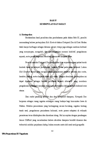 Penelitian ini mengkaji pertunjukan Ketoprak Dor dengan lakon Kuli Kontrak di Kota Medan sebagai sebuah fenomena budaya diaspora. Tujuannya adalah untuk menganalisis bagaimana aspek naratif dan bentuk pertunjukan tersebut merefleksikan perkembangan identitas komunitas Jawa perantauan.Penelitian dilakukan dengan menggunakan pendekatan kualitatif dan metode etnografi, melalui observasi partisipatif, wawancara mendalam dengan pelaku seni (seperti kelompok Sanggar Langen Setyo Pranajaya), dan analisis dokumen. Teori yang digunakan meliputi konsep diaspora dari James Clifford, hibriditas budaya dari Homi K. Bhabha, dan memori kolektif dari Maurice Halbwachs serta Irwan Abdullah.Hasil penelitian menunjukkan bahwa Ketoprak Dor bukan sekadar seni pertunjukan hiburan, tetapi berfungsi sebagai “ruang ingatan” (memory space) yang menghidupkan kembali sejarah migrasi paksa dan pengalaman kuli kontrak masa kolonial. Pertunjukan ini menampilkan bentuk hibriditas khas, berupa percampuran bahasa Jawa logat Medan dengan Melayu Deli, adaptasi cerita lokal, dan perpaduan instrumen musik Jawa dengan elemen Melayu. Melalui struktur dramatiknya yang sederhana namun simbolik, Ketoprak Dor menjadi wahana bagi generasi muda keturunan Jawa untuk terhubung dengan akar sejarah mereka sekaligus menegosiasikan identitas mereka dalam masyarakat Medan yang multietnis. Meskipun menghadapi tantangan modernisasi dan menurunnya minat generasi muda, Ketoprak Dor terus bertahan melalui berbagai strategi adaptasi, seperti inovasi konten, pemanfaatan media digital, dan kolaborasi lintas budaya. Dengan demikian, kesenian ini tidak hanya menjadi pelestarian tradisi, tetapi juga sebagai penanda dinamika identitas diaspora Jawa yang terus berkembang di Kota Medan