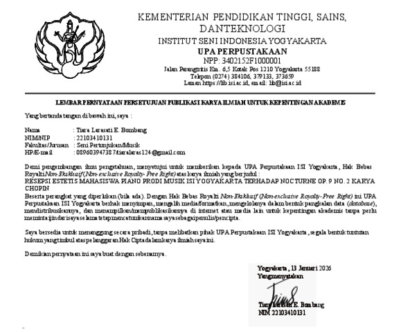 Larasati E. Bombang, Tiara (2026) Resepsi Estetis Mahasiswa Piano Prodi Musik Isi Yogyakarta Terhadap Nocturne Op. 9 No. 2 Karya Chopin. Skripsi thesis, Institut Seni Indonesia Yogyakarta.