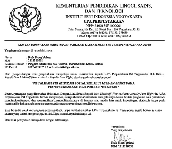 Faruq' Adani, Nafa (2025) Visualisasi Stratifikasi Sosial Melalui Mise-en-scène Pada Penyutradaraan Film Pendek "Dua Kaki". Skripsi thesis, Institut Seni Indonesia Yogyakarta.