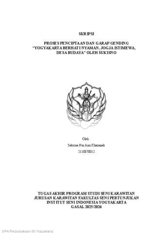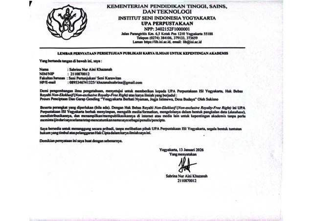 Nur Aini Khazanah, Sabrina (2026) Proses Penciptaan Dan Garap Gending “Yogyakarta Berhati Nyaman, Jogja Istimewa, Desa Budaya” Oleh Sukisno. Skripsi thesis, Institut Seni Indonesia Yogyakarta.
