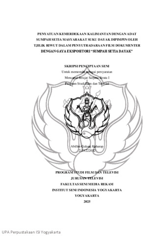 Galang Kaharap, Abilleo (2026) Penyatuan Kemerdekaan Kalimantan dengan Adat Sumpah Setia Masyarakat Suku Dayak Dipimpin oleh Tjilik Riwut dalam Penyutradaraan Film Dokumenter dengan Gaya Ekspositori “Sumpah Setia Dayak”. Skripsi thesis, ISI Yogyakarta.