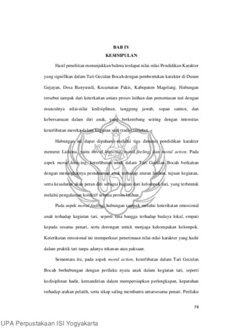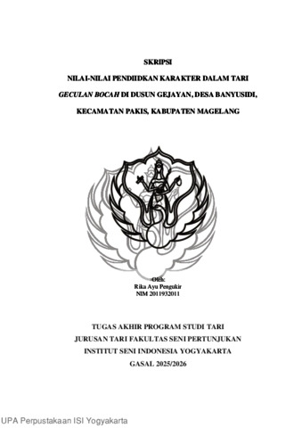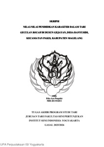 Pengukir Ayu, Rika (2025) Nilai-Nilai Pendidikan Karakter Dalam Tari Geculan Bocah Di Dusun Gejayan Desa Banyusidi Kecamatan Pakis Kabupaten Magelang. Skripsi thesis, Institut Seni Indonesia Yogyakarta.