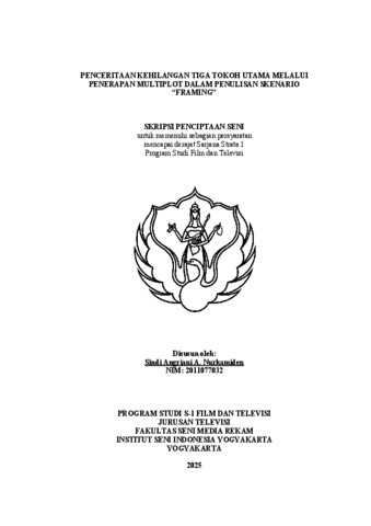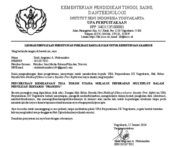 Angriani A. Nurkamiden, Sindi (2025) Penceritaan Kehilangan Tiga Tokoh Utama Melalui Penerapan Multiplot Dalam Penulisan Skenario “Framing”. Skripsi thesis, Institut Seni Indonesia Yogyakarta.