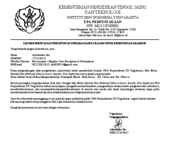 Jati, Adyatmaka (2025) Peran Modal Sosial dalam Mempertahankan Keberlangsungan Kelompok Musik. Studi Kasus : The Cloves and The Tobacco. Masters thesis, Institut Seni Indonesia Yogyakarta.