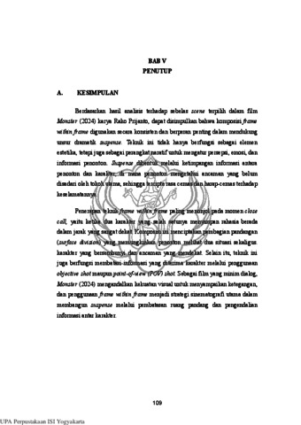 Penelitian ini membahas penerapan teknik komposisi frame within frame dalam mendukung suspense pada film Monster (2024) karya Rako Prijanto. Film ini menarik untuk dikaji karena minim dialog dan lebih menonjolkan kekuatan visual untuk membangun ketegangan. Sebagai film bergenre thriller, Monster mengandalkan aspek sinematografi untuk menciptakan suasana cemas dan tegang tanpa harus bergantung pada narasi verbal. Penelitian ini menggunakan metode kualitatif dengan pendekatan deskriptif melalui analisis terhadap sebelas scene yang teridentifikasi memuat unsur dramatik suspense dan penerapan komposisi frame within frame. Data dikumpulkan melalui observasi film, pencatatan adegan, serta dokumentasi visual berupa tangkapan layar (screenshot). Proses analisis dilakukan melalui tahapan reduksi, penyajian, dan penarikan kesimpulan guna mengetahui hubungan antara teknik visual dengan pembangunan ketegangan. Hasil penelitian menunjukkan bahwa komposisi frame within frame digunakan secara konsisten melalui elemen seperti pintu, jendela, dan cermin untuk menciptakan pembagian ruang, mempersempit informasi visual, serta menonjolkan perbedaan informasi antara penonton dan karakter.
