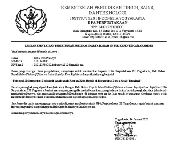 Dwi Prasetyo, Indra (2025) Foto Dokumenter Deskriptif Anak-Anak Rentan Kota Depok Di Komunitas Lensa Anak Terminal. Skripsi thesis, Institut Seni Indonesia Yogyakarta.