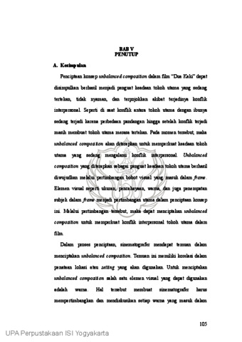 Film Dua Kaki mengangkat isu tentang penggusuran lahan yang marak dilakukan demi kepentingan dan keuntungan kelompok tertentu. Penggusuran yang dilakukan tidak pernah mempertimbangkan keberlangsungan hidup dan hanya meninggalkan penderitaan bagi orang-orang yang terdampak. Cerita dalam film ini akan berfokus pada tokoh utama bernama Dani yang ingin memperjuangkan lahan pasar agar tidak direlokasi namun terhalang oleh ibunya sendiri, yaitu Kartinah. Perbedaan pandangan antara Dani dan Kartinah dalam memperjuangkan lahan pasar agar tidak direlokasi membuat hubungan antara mereka berdua terasa renggang. Hal tersebut memicu timbulnya konflik interpersonal yang membuat Dani merasa tertekan, tidak nyaman, dan terpojokkan. Keadaan yang sedang dialami Dani begitu penting untuk ditonjolkan agar dapat tergambarkan dengan jelas dan penonton dapat turut merasakan. Penciptaan ini berfokus pada penerapan konsep unbalanced composition untuk memperkuat konflik interpersonal tokoh utama. Unbalanced composition akan diwujudkan melalui elemen visual, seperti pencahayaan, warna, ukuran, dan juga penempatan subjek yang mempengaruhi bobot visual dalam frame. Melalui pertimbangan tersebut, komposisi gambar yang terasa tidak seimbang akan dapat diciptakan. Penelitian ini menunjukkan keberhasilan dalam penciptaan konsep unbalanced composition sebagai penguat keadaan tokoh utama yang sedang mengalami konflik interpersonal. Pendekatan visual yang digunakan mampu memperkuat keadaan tertekan, tidak nyaman, dan terpojokkan yang dialami Dani akibat konflik interpersonal yang sedang terjadi.
